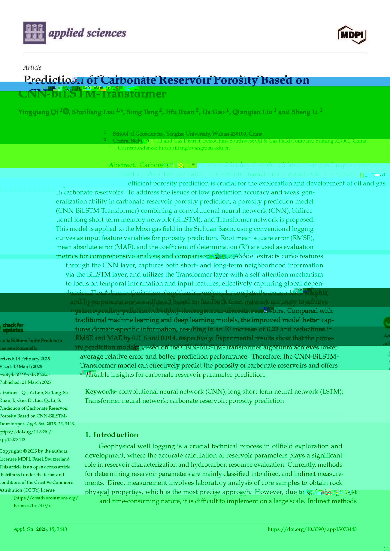 永利6774app手机版官网碩士生漆影強在SCI收錄期刊《Applied Sciences》上發表題為“Prediction of Carbonate Reservoir Porosity Based on CNN-BiLSTM-Transformer”的研究論文。永利6774app手机版官网為論文第一署名單位,羅水亮副教授為第一通訊作者,論文由中國青年基金國家自然科學基金項目資助。