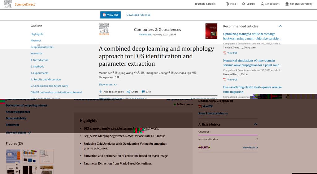 近日,地科學院碩士生葉茂林在導師王慶副教授的指導下,于SCI二區期刊《Computers & Geosciences》發表題為《A combined deep learning and morphology approach for DFS identification and parameter extraction》的研究論文,提出一種融合深度學習與河流形态學的分布式河流系統(DFS)參數自動化提取方法,為沉積盆地分析與資源勘探提供了智能化解決方案。