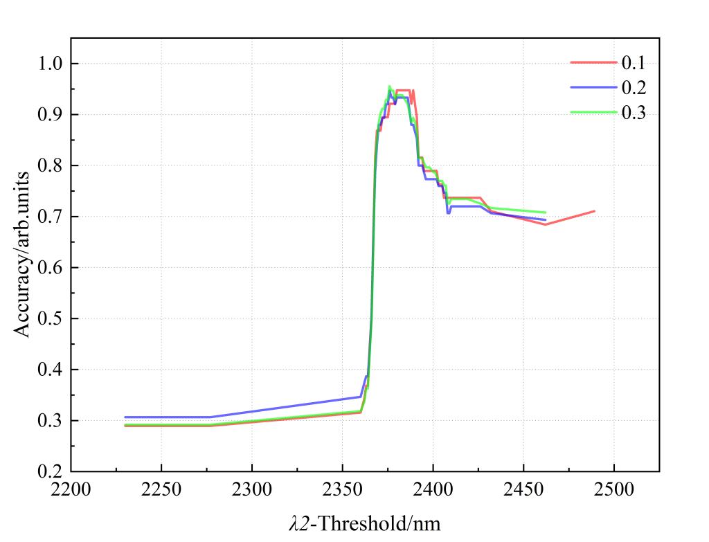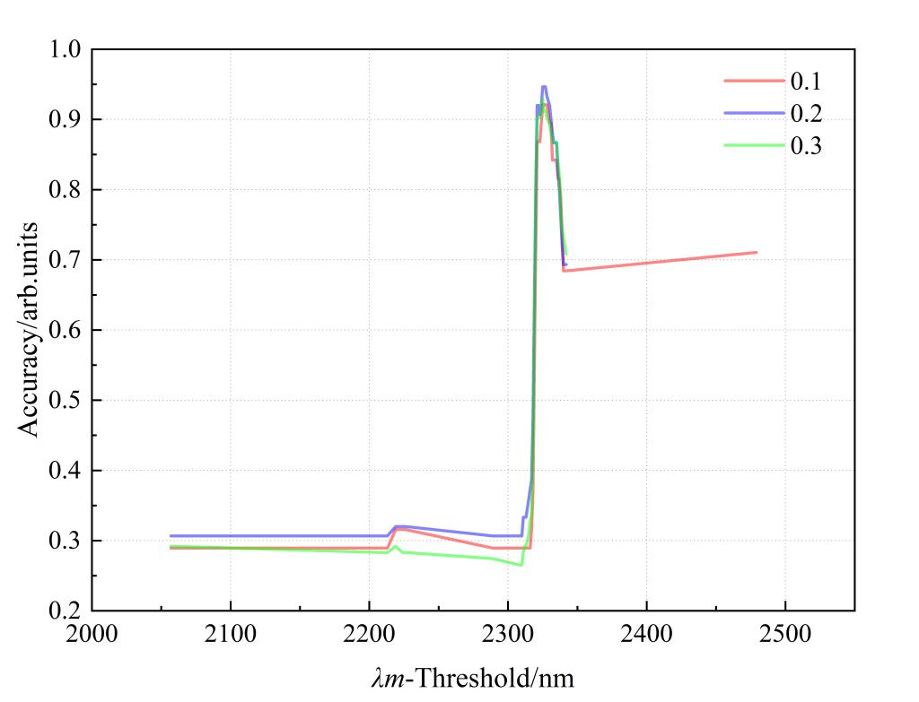 圖1不同特征在不同測試集下的分類準确率。(a)吸收谷最低點波長;(b)吸收帶右肩波長;(c)吸收帶寬度