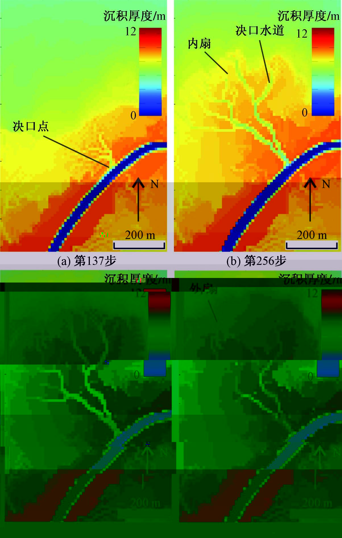 該研究基于衛星影像與野外實地勘測,結合國際領先的Delft3D沉積數值模拟技術,成功還原了決口扇從形成到消亡的全過程。研究表明,東營子決口扇由決口水道、複合内扇與外扇三部分組成,其演化受氣候幹濕變化驅動,可分為四大階段:決口爆發期;内扇萌芽期;内扇繁盛期;外扇形成期。