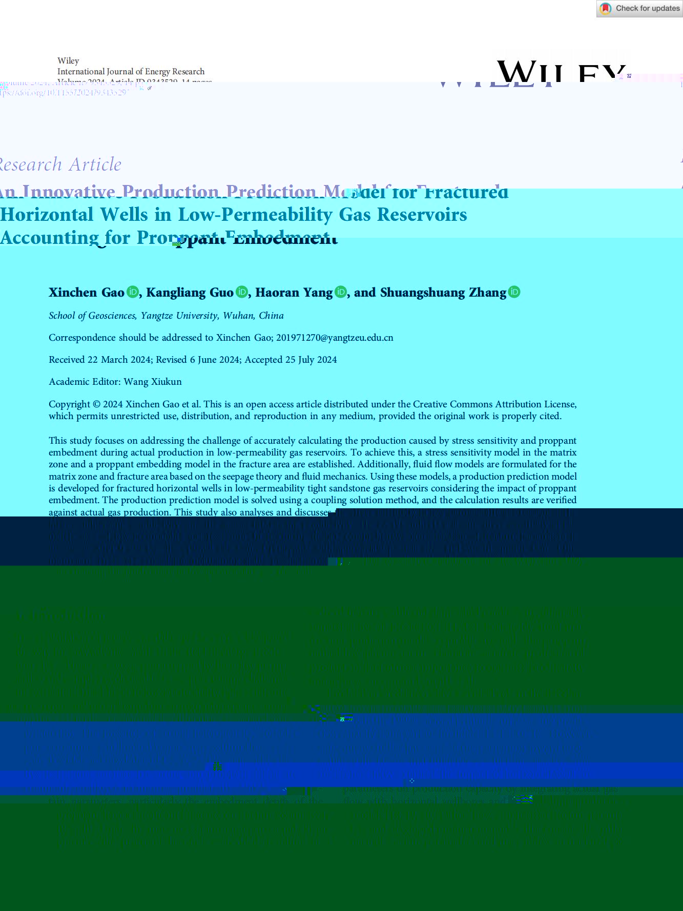永利6774app手机版官网22級博士研究生在期刊《International Journal of Energy Research》上發表題為“An Innovative Production Prediction Model for FracturedHorizontal Wells in Low-Permeability Gas ReservoirsAccounting for Proppant Embedment”的研究論文。永利6774app手机版官网為論文第一署名單位,高昕晨為第一通訊作者。