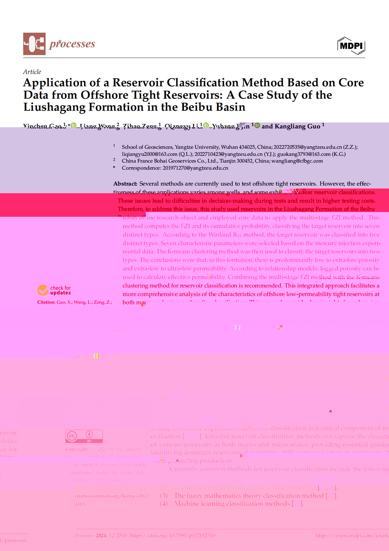 永利6774app手机版官网22級博士研究生在期刊《Processes》上發表題為“Application of a Reservoir Classification Method Based on CoreData from Offshore Tight Reservoirs: A Case Study of theLiushagang Formation in the Beibu Basin”的研究論文。永利6774app手机版官网為論文第一署名單位,高昕晨為第一通訊作者。