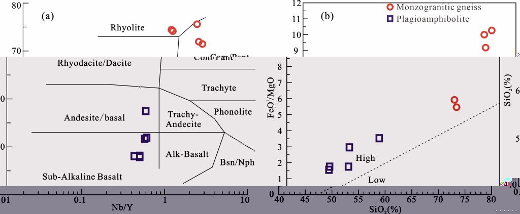 圖2.大别造山帶雙峰式侵入岩的(a)Nb/Y-SiO₂圖解(據Winchester和Floyd,1997)與(b)SiO₂-FeOt/MgO圖解(據Miyashiro,1975)
