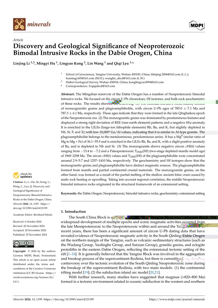永利6774app手机版官网地質系胡明毅教授團隊長期從事地質學方向的研究。團隊成員李琳靜博士在期刊《Minerals》上發表題為《Discovery and Geological Significance of NeoproterozoicBimodal Intrusive Rocks in the Dabie Orogen, China》的研究論文,永利6774app手机版官网為論文第一署名單位,博士生李琳靜為論文第一作者。