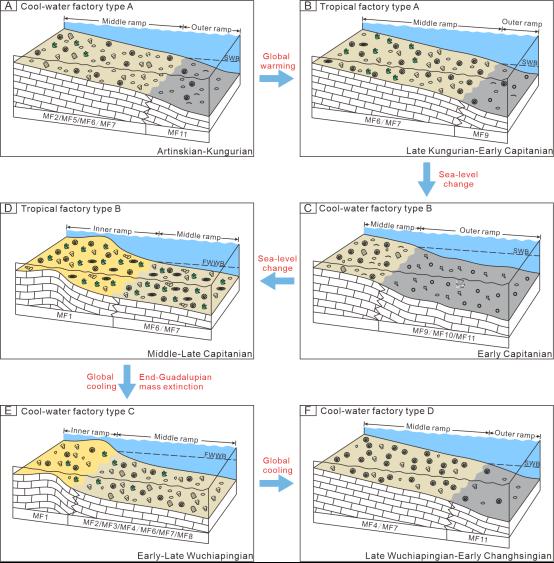碳酸鹽工廠概念的提出是為了解釋碳酸鹽生産的空間與過程,這一進程受氣候變化的影響較為顯著。二疊紀時期發生了幾次重大的氣候變化事件,對碳酸鹽工廠生産産生了相當大的影響。但二疊紀碳酸鹽工廠對這些氣候事件的響應仍不太清晰。因此本文選取鄂西沿渡河剖面進行碳酸鹽岩微相分析,探讨碳酸鹽工廠與氣候變化之間的關系。研究發現,鄂西沿渡河剖面二疊系地層可識别出10種沉積微相類型,并将其分為3個微相組合,分别對應内緩坡、中緩坡以及外緩坡沉積環境。同時識别出8個海侵-海退體系域,揭示了與華南其他地區相同的海平面變化趨勢。此外,依據不同層位生物組合差異,共劃分出6種碳酸鹽工廠,并識别出5次碳酸鹽工廠轉變。其中,發生在空谷階晚期以及吳家坪階早期的轉變可能與氣候變化有關,而發生瓜德魯普世末期的轉變可能受生物滅絕事件與氣候變化共同影響。其餘兩次轉變則與海平面波動有關。因此,氣候變化可能通過影響表層海水溫度以及海平面升降,從而控制産生碳酸鹽的生物群落,進而導緻碳酸鹽工廠類型轉變。