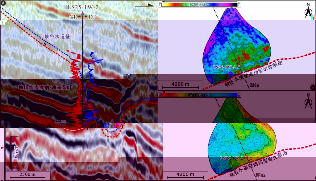 圖1過井(LS25-1W-2)地震(圖a)及其對應均方根平面屬性圖(圖b)和構造圖(圖c)描述了峽谷水道壁遮擋海底扇砂岩形成岩性圈閉的典型實例