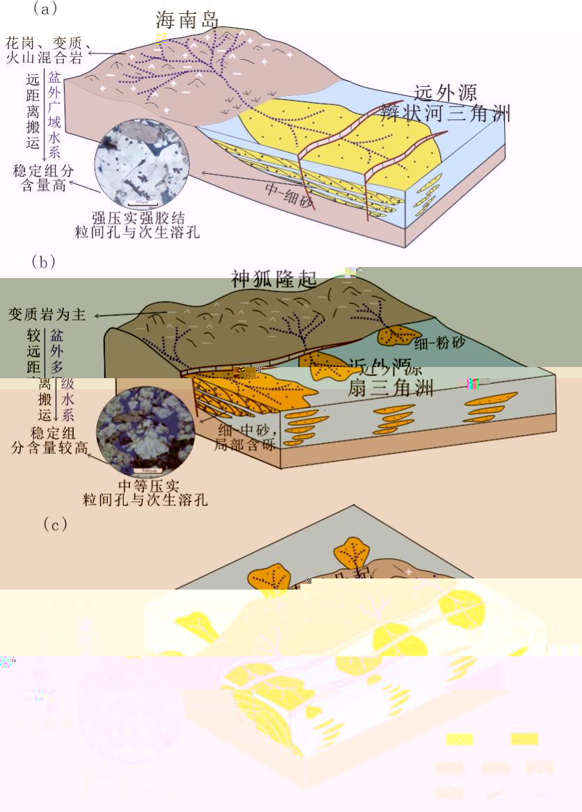 文章認為寶島-長昌凹陷陵水組儲層發育受源彙系統要素和成岩作用的共同影響,其中物源、搬運路徑、構造古地貌等源彙要素影響沉積體的組成、分布與規模,成岩作用對儲層有直接控制作用。外源型源彙系統儲層砂岩中穩定組分含量高,有利于一定的抗壓實作用;内源型源彙系統砂岩組分中長石含量高,溶蝕作用十分發育。