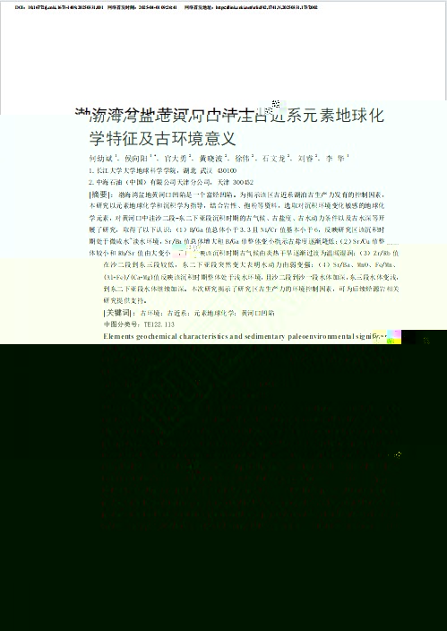 該論文以元素地球化學和沉積學為指導,結合岩性、孢粉等資料,選取對沉積環境變化敏感的地球化學元素,對黃河口中窪沙二段-東二下亞段沉積時期的古氣候、古鹽度、古水動力條件以及古水深等開展了研究,取得了以下認識:(1)B/Ga值總體小于3.3且Ni/Cr值基本小于6,反映研究區該沉積時期處于微鹹水~淡水環境,Sr/Ba值總體增大和B/Ga值整體變小指示古鹽度逐漸降低;(2)Sr/Cu值整體較小和Rb/Sr值由大變小,反映該沉積時期古氣候由炎熱幹旱逐漸過渡為溫暖濕潤;(3)Zr/Rb值在沙二段到東三段較低,東二下亞段突然變大表明水動力由弱變強;(4)Sr/Ba、MnO、Fe/Mn、(Al+Fe)/(Ca+Mg)值反映該沉積時期整體處于淺水環境,且沙二段到沙一段水體加深,東三段水體變淺,到東二下亞段水體繼續加深。本研究揭示了研究區古生産力的環境控制因素,可為後續烴源岩相關研究提供支持。