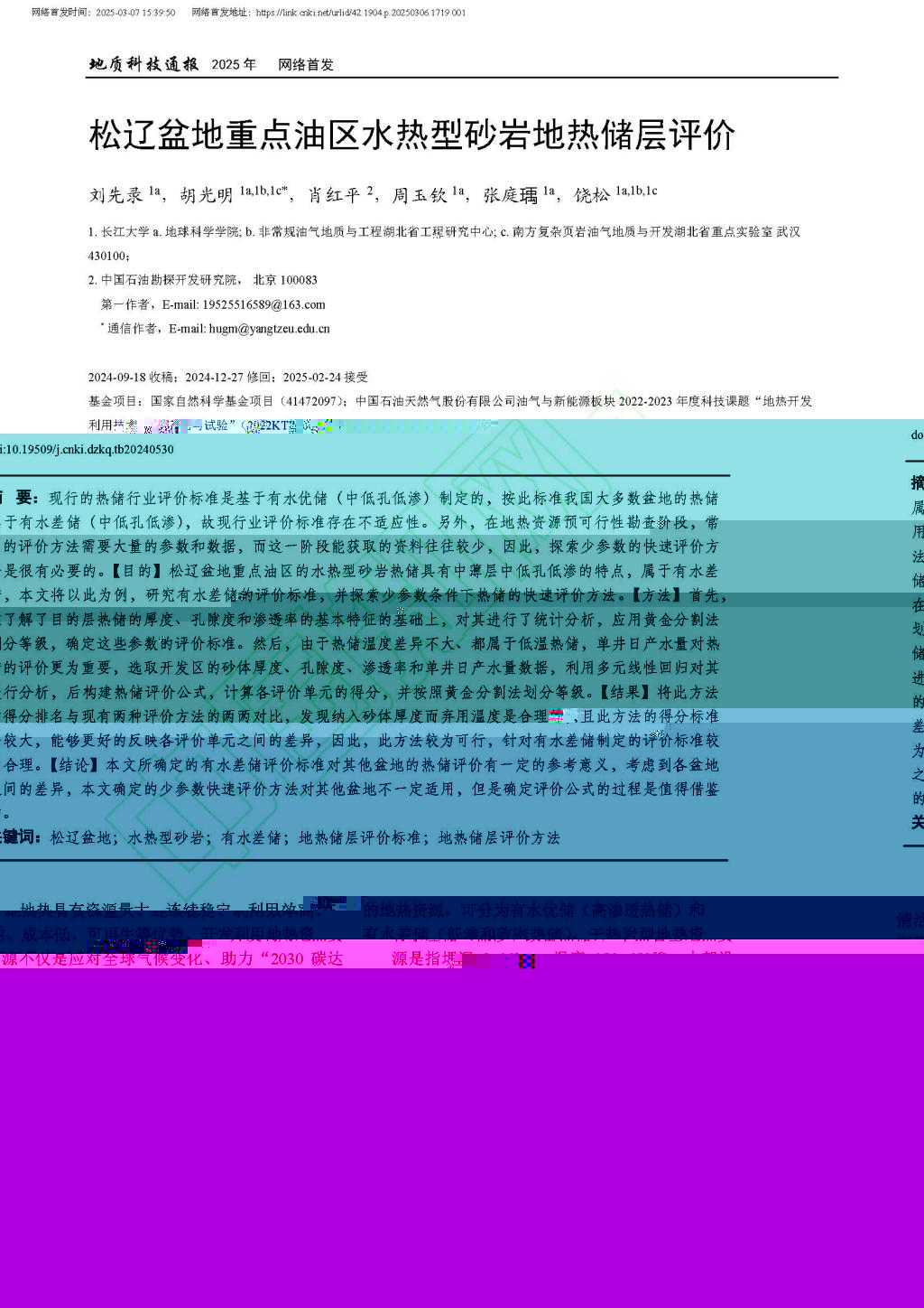 地科院碩士生劉先錄在胡光明教授的指導下,在期刊《地質科技通報》上發表題為“松遼盆地重點油區水熱型砂岩地熱儲層評價”的研究論文,永利6774app手机版官网為論文第一署名單位,碩士生劉先錄為論文第一作者,其導師胡光明教授為該文通訊作者。