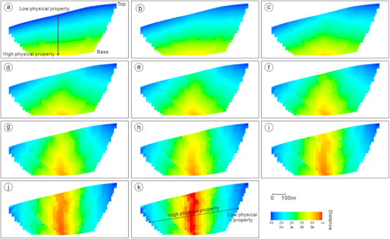 塔裡木盆地桑塔木油田三疊系TIII油組由多期河道互相切割、疊置形成,砂地比可達90%以上,且河道内部砂體空間儲集性質和滲流性質具有強非均質性特征,給儲層三維地質建模帶來了極大的不确定性。為精細刻畫不同期次河道内部儲層非均質性特征,論文提出了一種相與物性模型同步模拟的策略,依據融合多方向砂體分布規律建立的砂體趨勢概率體約束模拟結果。模拟結果反映了自河道中線向兩側,自底向頂岩相粒度由粗變細,物性由好變差的砂體展布規律。該方法最終建立的模型結果不再呈現“泛連通體”特征,不但提高相與物性模型的合理性,更準确地表征水下分流河道内部非均質性特征,為辮狀河三角洲前緣高砂地比儲層剩餘油分布及開發決策提供科學依據。