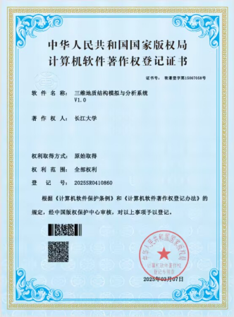 永利6774app手机版官网碩士生吳栩璇開發的軟件《三維地質結構模拟與分析系統》取得了軟件著作權并進行成果轉化。永利6774app手机版官网為第一申請人,碩士研究生吳栩璇為第一發明人。