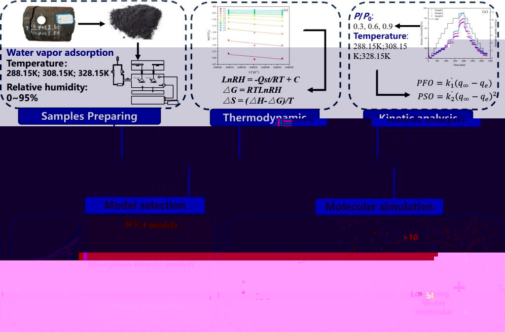 富有機質頁岩儲層孔隙中普遍含水,明确水在頁岩有機質中的賦存特性,對于進一步探讨頁岩儲層微觀氣水分布、提高頁岩氣采收率等問題具有重要的理論和實踐意義。本次研究以川南龍馬溪組頁岩幹酪根為研究對象,通過熱解、激光拉曼光譜、水蒸氣吸附(WVA)實驗方法與分子動力學模拟,開展了GAB、Dent等7種熱力學模型及PFO、PSO等5種動力學模型的拟合分析;明确了不同溫度下幹酪根對水蒸氣的吸附量與熱力學參數(ΔH、ΔG、ΔS)關系,揭示了不同含水量對甲烷吸附量和吸附熱的控制作用。
