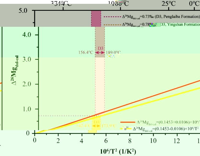 研究結果表明:微-粉晶白雲石(D1)的δ26Mg值範圍為−1.98到−1.69‰,細-中晶白雲石(D2)為−1.68到−1.33‰,中-粗晶白雲石(D3)為−2.35到−1.99‰。根據鎂同位素平衡分餾溫度方程,Δ26Mgdol−fluid= −0.1554(±0.0096) ×106/T2或 Δ26Mgdol−cal= 0.1453(±0.0106) × 106/T2,計算得到D1的形成溫度範圍為45.0到65.4°C,D2為53.1到73.9°C,D3為142.4到173.9°C 或 156.4到189.0°C(圖3和圖4)。這些溫度估算值與先前文獻中相同地層的流體包裹體和耦合同位素研究所得的溫度結果接近,支持了鎂同位素作為白雲石形成溫度測定方法的可靠性。本研究提出了一種創新的方法,利用鎂同位素評估白雲石的形成溫度,為解決“白雲石問題”提供了重要的見解。