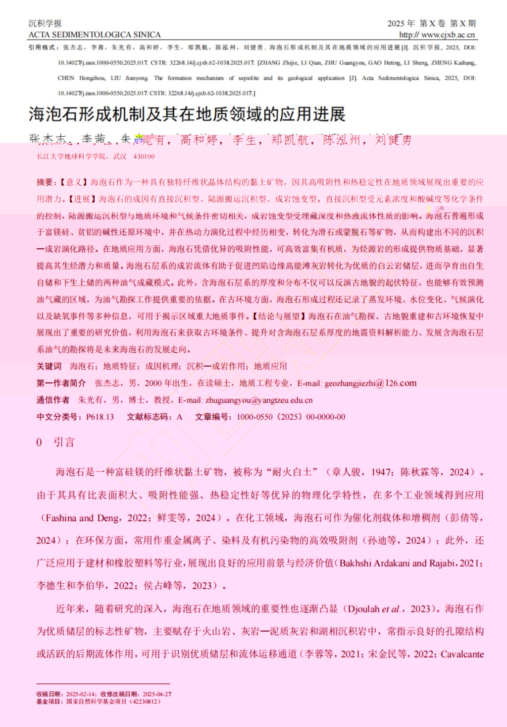 近日,永利6774app手机版官网24級研究生張傑志在核心期刊《沉積學報》上發表了題為《海泡石形成機制及其在地質領域的應用進展》的論文(共32頁)。全部作者均來自永利6774app手机版官网師生,研究生張傑志為論文第一作者,其導師朱光有教授為通信作者。論文重點讨論了海泡石的地質特征、成因機制、沉積—成岩的關系以及在地質領域的應用。